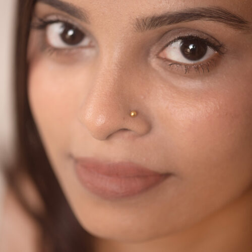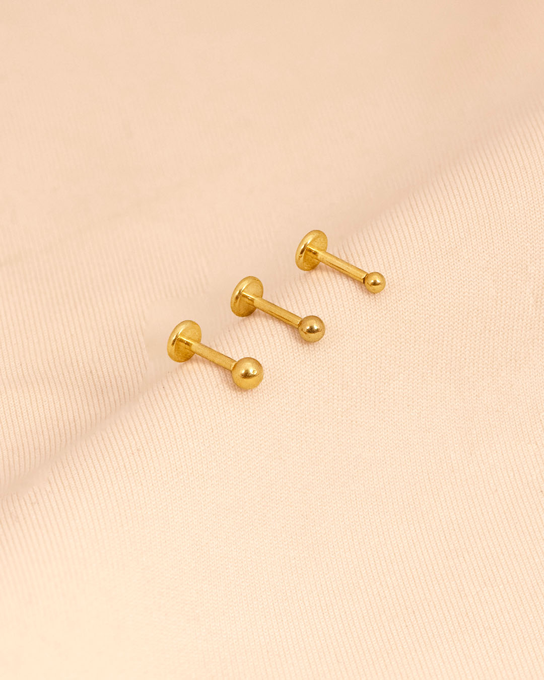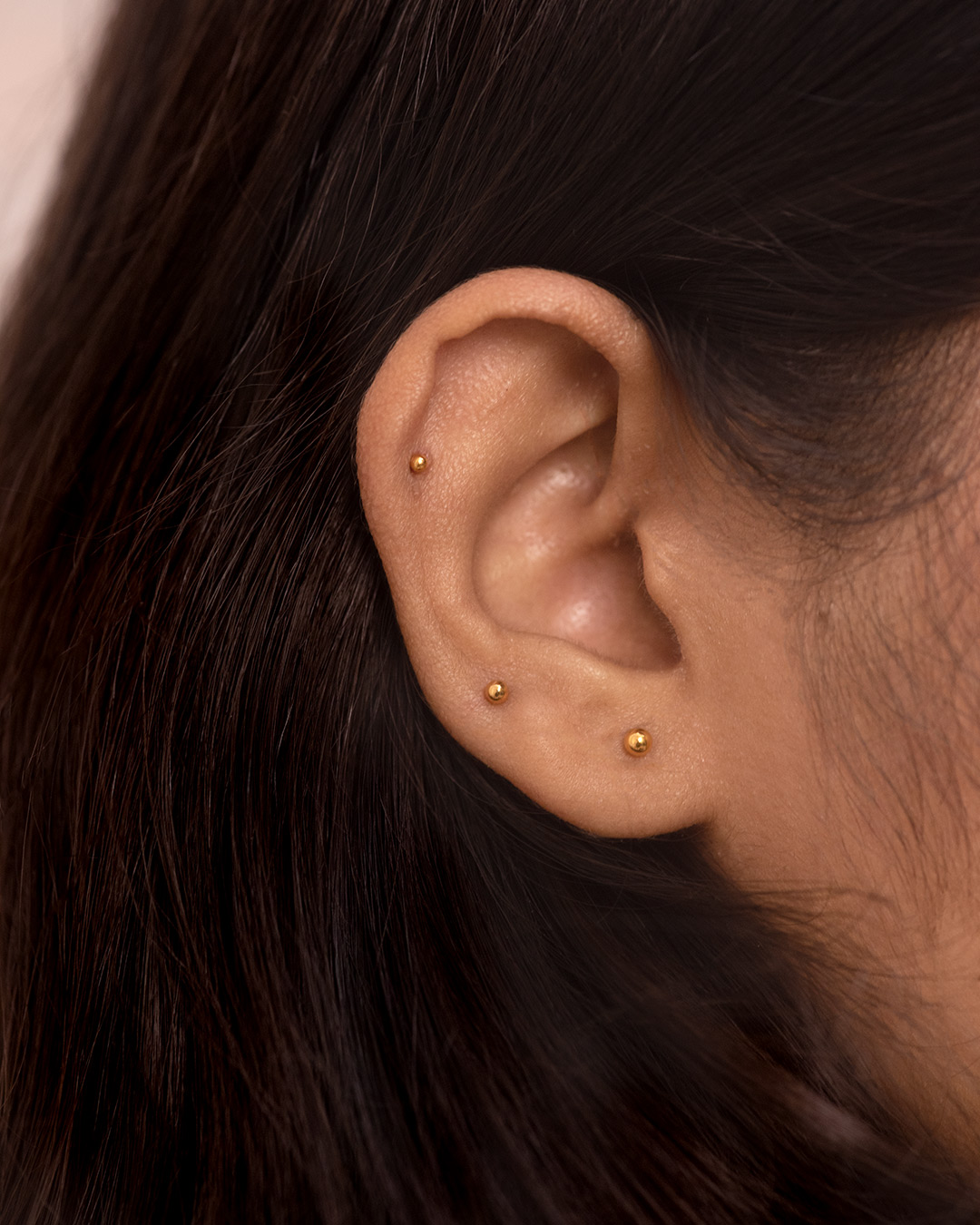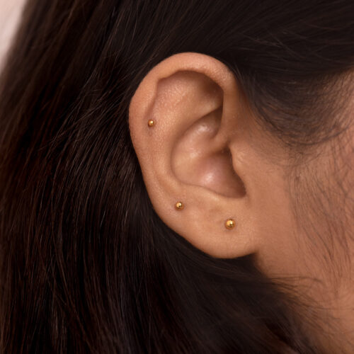 A polished, micro-sized metal sphere that sits flat against the skin. Minimal and understated, it works beautifully across the main lobe, upper lobe, helix, other upper ear piercings, or as a delicate nose pin.